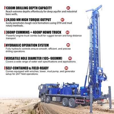 يضم محرك ديزل Cummins 360HP مثبتًا على هيكل Sinotruck قوي 8 × 4 ، وهو CSD1300 مصمم خصيصًا لتحدي التضاريس والمتانة الطويلة. من القرى النائية إلى مناطق البناء الصناعية ، يحول هذه الحفارة أي موقع إلى محطة حفر مجهزة بالكامل ومستقلة بذاتها-كاملة مع إعداد المولدات ، والبرج الذي يسيطر عليه الهيدروليكي ، و Winches ، ومضخة الطين ذات الضغط العالي BW1500/12.